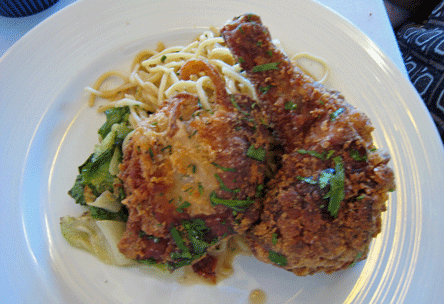 In describing the day’s specials, Daniel explained that Chef Lemon’s pan-fried buttermilk chicken has been flying off the kitchen. There’s a reason for that. This is some of the very best fried chicken we’ve had since leaving Mississippi in 1995 and it would be considered a great fried chicken even in the deep south. It’s a quarter chicken–breast, thigh and leg–with a lot of juicy white meat impregnated just noticeably by the tanginess of preserved lemon. The seasoned flour coating is light and delicate. Normally served with polenta, we requested pasta instead and Daniel accommodated. The pasta was flavored with chicken pan jus, an excellent touch.