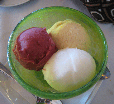 Despite outdoor temperatures approaching temperatures more often experienced by polar bears than by thin-blooded New Mexicans, my Kim had a trio of sorbets: vanilla, lemon and blood orange, all served on a large green goblet. The sorbets are rich and creamy with pronounced flavor profiles. Vanilla bean is in evidence throughout the vanilla sorbet while the two citrus-based sorbets have the tangy intensity lemon and orange aficionados appreciate. It’s never too cold for sorbet this good!