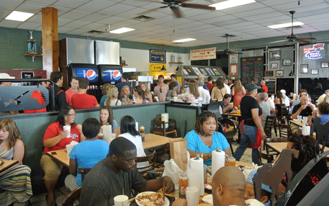 Lines of hungry diners snake out the door and spill out onto the parking lot. When you get to the door, you’re still about 45 minutes away from placing your order, but you’ll have access to paper menus which will probably be covered with drool by the time you reach the counter. The line slows to a crawl until finally, you get to a counter where you place your order, fill your beverage cup from a self-serve dispenser and keep an eye out for one of the 70 seats to come open. Fortunately, many of the orders are of the take-out variety and there’s a separate order and pick-up station for to-go orders.