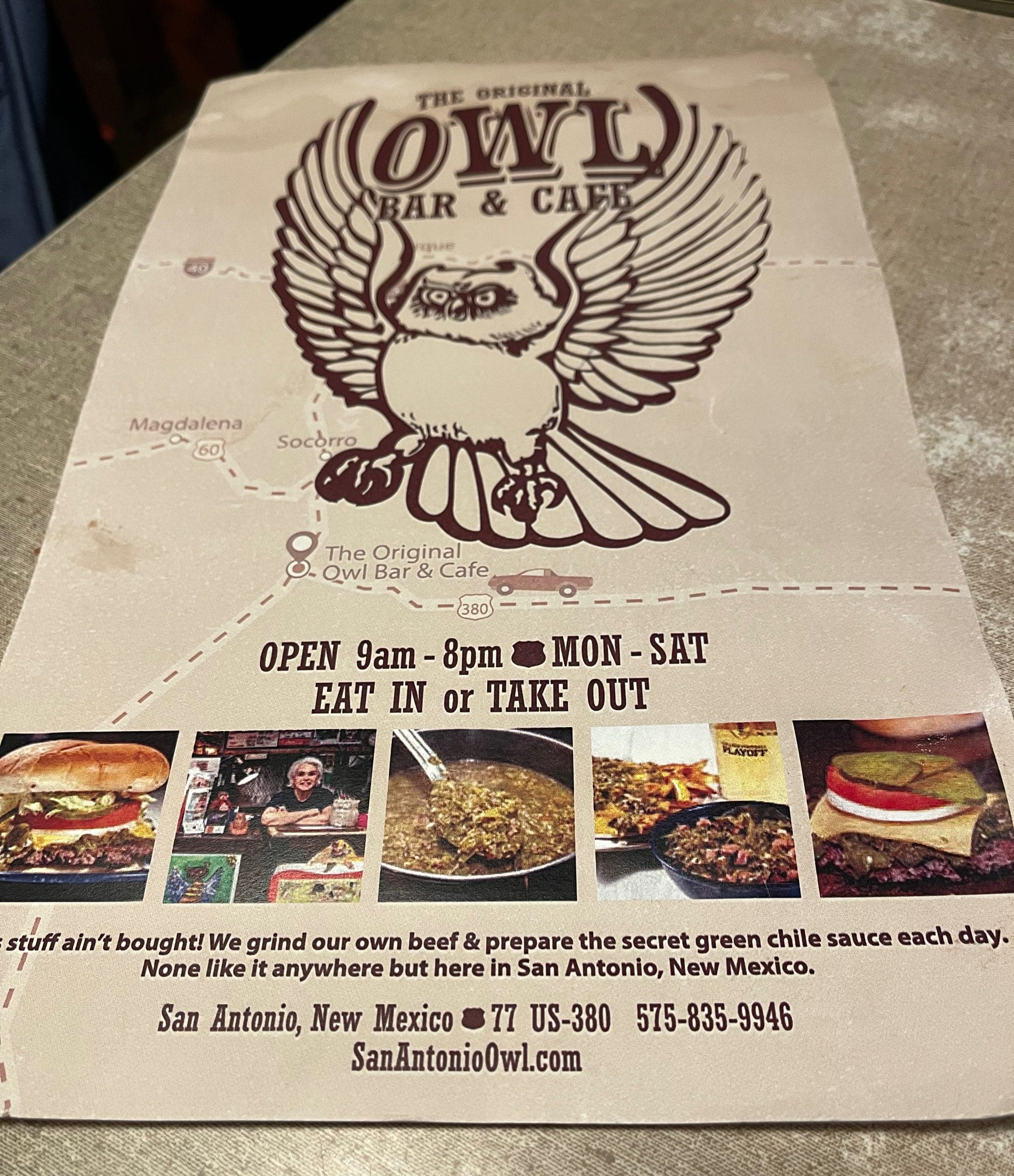 25 February 2023: Over the past twelve years, the Owl Cafe in San Antonio, New Mexico has been one of the three most frequently launched reviews on Gil’s Thrilling (And Filling) Blog, ranking behind only Mary & Tito’s and the Buckhorn Tavern as the third most frequently launched review of all time. What accounts for the Owl’s popularity? It truly is a timeless institution beloved for its consistently excellent burgers.