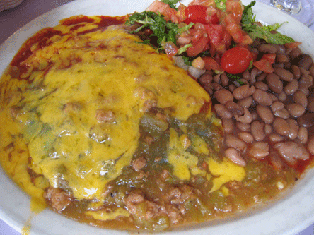 Unlike many Northern New Mexico restaurants, Rancho De Chimayo has not “anglicized” its entrees and still serves chile that does more than decorate the plate with color; it adds that distinctive, addictive flavor all native New Mexicans crave–and cumin won’t come within a mile of this chile. Ask a waitress if the carne adovada is made with cumin and either you’ll get a blank expression reflective of the abominable spice’s lack of use throughout Northern New Mexico or you’ll get a response indicating the restaurant holds true to the authenticity of New Mexican cuisine and that means no cumin.