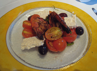 The main course selection calling most loudly during our visit in August, 2010 was a sauteed filet of salmon with tomato risotto and olive tapenade, creamed corn and Reisling grapes. Salmon is one of the most common fish entrees served across America, an almost seemingly de rigueur entree at fine dining establishments. Almost invariably, “inventive” chefs try doing things with that salmon which don’t necessarily complement it. It would be interesting to see what Chef Johnson had in mind for the farm-raised salmon.
