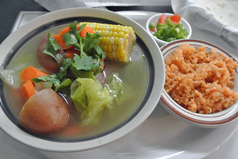 If you’re the type of person who likes curling up in front of the fireplace with a steamy mug of cocoa on a cold winter day, you’re probably the type of person who appreciates a good soup. Mexicans appreciate a good soup very much, especially caldo de res, a rich beef stock brimming with rich, fork-tender bits of meat from a beef hock and vegetables (celery, carrots, potatoes, cabbage and even corn-on-the-cob) topped with cilantro. Made well, it will cure whatever ails you more effectively than any chicken noodle soup. Rey’s rendition of caldo de res will most assuredly cure the winter blahs or any other time blues. It’s an excellent soup with a broth you’ll slurp up with gusto. The vegetables are perfectly prepared, fresh and delicious. It’s served with rice and a small plastic cup of finely chopped green peppers and tomatoes.