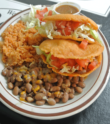 So what makes these tacos so unique? It starts with a fried corn tortilla that’s obviously not out-of-the-box. The tortillas are lightly fried with char marks which seem to indicate some time on a comal. The tacos are engorged not with shredded or ground beef, but with a well-seasoned hamburger patty. That’s a first for me. The de rigueur lettuce, tomatoes and shredded cheese are there, too, and while some restaurants serve a side of house salsa for their tacos, Rey’s provides a ramekin of chile pequin salsa made from a 112-year-old family recipe. You’ll want to spoon it on generously or maybe even dip your tacos into this unique salsa.