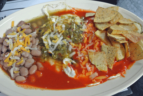 As much as Ruben loves carne adovada, he doesn’t wax eloquently about his love for it on a thematic blog as does a Duke City blogger so passionate about her culinary passion that she launched a blog to celebrate the best huevos rancheros in New Mexico. Her Huevos Addiction blog is a terrific read with her review of Rey’s huevos rancheros inspiring me to try her favorite dish. Rey’s huevos rancheros are simplicity itself–corn tortillas on the bottom, fried eggs on top and the whole thing slathered with chile (red and green for me). The huevos are served with sides of beans and papitas (some of the best in town). Simplicity does not mean plain or boring, not as long as you’ve got Rey’s red chile (described on Huevos Addiction as “for those who have said their prayers.”)