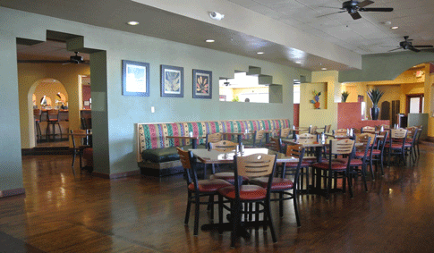 You will see prickly pear cacti used in the restaurant’s decor, but not the ones with painful spines and prickles. Instead you’ll find multi-hued artist’s renditions of the prickly pear in the form of a tin sculpture. The restaurant is a very attractive, artsy milieu adorned in a soft Southwestern color palette and hard-wood floors. A sizeable waiting area with large enveloping couches has the feel of a comfortable family den. An adjacent full-service bar offers several televisions for your viewing pleasure. The overhead lighting above the booths is in the shape of balloon envelopes, fashioned from wire.