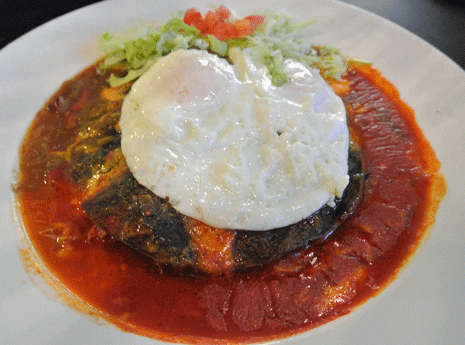 Enchiladas are also a good bet. At the Prickly Pear, they’re served stacked as so many Northern New Mexico restaurants prepare them. Try them with perfectly prepared blue corn tortillas, circular orbs which drape over a heaping helping of shredded beef topped with melted shredded Cheddar cheese, two eggs over-easy with Christmas-style chile. The red chile has very little piquancy and we found it a bit over-salted, but the green chile is quite good. It’s got a bit of a bite and a roasted smokiness. It’s the superior of the two chiles.