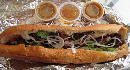 Relatively new (as of 2011) to the Viet Rice menu is a “Vietnamese sandwich,” the longest one in the Duke City area, in fact. At an even twelve-inches, this sandwich is twice the length of the banh mi served at some Vietnamese restaurants. Length, however, doesn’t translate in this case to best. The sandwich is offered with your choice of four grilled meats: pork, beef, chicken, meatball and beef wrap. The bread is a bit more crusty than traditional French baguettes, but it’s a very good bread. Unfortunately, the ingredients nestled within its crusty confines are parsimonious. On the two sandwiches I’ve had–grilled pork and grilled beef wrap–the only sandwich ingredients between bread were cilantro and one jalapeño for every three inches of sandwich. Unlike my favorite banh mi (at May Hong and Banh Mi Coda), it did not include pickled carrots and daikon, cucumber and Vietnamese mayo. Interestingly, it is accompanied not by fish sauce, but by a peanut sauce very reminiscent of Thai peanut sauces.