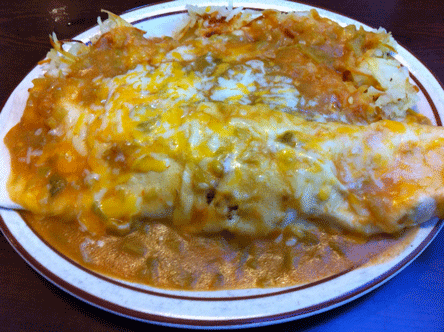 New Mexican food is available for both breakfast and lunch. Breakfast burritos are the size of a motorcycle’s sidecar. They start with three scrambled eggs folded inside a flour tortilla smothered with your choice of red and/or green chile, Cheddar and Jack cheeses served with hash browns (out of the bag and nothing special). Both the red and green chiles are made with a surfeit of cornstarch, an unnecessary thickener which may actually detract from the flavor of the chile.