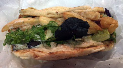 5 August 2015: It took until my fifth visit to Anatolia before I finally ordered a sandwich…and it wasn’t a doner kebab. Interest piqued by its sheer uniqueness, I ordered a leg of lamb kebab sandwich, something we never saw in all the kebab eateries in England. Leg of lamb isn’t the sole unique ingredient from which this sandwich is crafted. French fries occupy the very top layer. They’re a bit on the flaccid side and don’t add much to the flavor profile so you might want to pluck them off and enjoy the other ingredients: mixed greens, a dill-cucumber sauce and tender, moist leg of lamb so heavily (and heavenly) spiced that it’ll wreck your breath. The French fry anomaly aside, this is an excellent sandwich!