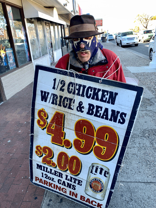 On any given day, on a Central Avenue median between the Bandido Hideout restaurant and the University of New Mexico, you can spot a masked luchador sporting a sandwich board advertising “1/2 Rotisserie Chicken.” You’ve got to wonder what persona his mask represents–El Taco Technico, Guacamole Guapo, Señor Salsa… The staff at Bandido Hideout confirms that like the mail carrier, neither rain, nor sleet nor Albuquerque’s winds will stay this luchador from the entertaining completion of his appointed route on Central Avenue.