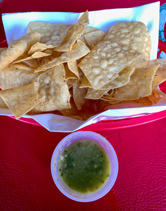 Salsa and a basket of chips reach your table shortly after you do. In days gone by, as many as three salsas accompanied each order and they were always complimentary. The salsa de arbol is the most piquant, but some of its sting is remediated by the infusion of lime. The guacamole based salsa is only mildly piquant but rich in the buttery smooth flavor of well-ripened avocados. The third salsa is rarely seen in New Mexico, but is common in the state of Puebla. It’s salsa de cacahuates con Guajillo, a peanut salsa with chile Guajillo. It may remind you of the peanut sauces so prevalent in Thai foods without the sometimes tooth-decaying sweetness. During a visit in January, 2020, the salsa delivered to my table was a neon green salsa with a pleasant piquancy.