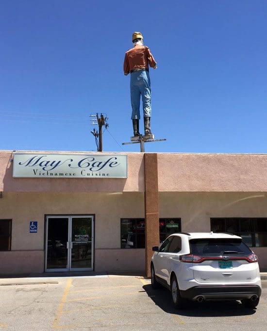 The May Cafe is situated on Louisiana just south of Central. The most conspicuous sign that you’ve arrived is a 27-foot tall fiberglass statue of Paul Bunyan just behind the restaurant. Weighing more than 2,000 pounds and wielding an axe as long as a compact car, the giant lumberman has been perched on a customized steel beam 25 feet above the ground for more than four decades. Anywhere but in Albuquerque the behemoth statue might seem out-of-place, but here it’s become a beloved local landmark.