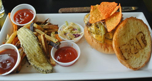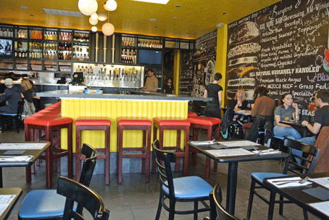 The restaurant’s cynosure is a decidedly unmanly square bar skirted with what resembles yellow-striped wallpaper. Behind the bar is a wall of tap handles which dispense a locavore’s treasure trove of local micro-brews from Turtle Mountain, Chama River, Marble and more. The beef is also procured locally–it’s New Mexico farm-fresh Angus beef that is grass-fed, free-range and sustainable. B2B uses a custom grind of one-third premium cut, all natural, humanely handled beef which is steroid, hormone and antibiotic free. All patties are house-made and weigh in at over a third-pound when they hit the open flame grill. Burgers are prepared at medium unless otherwise requested.