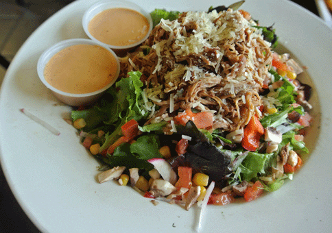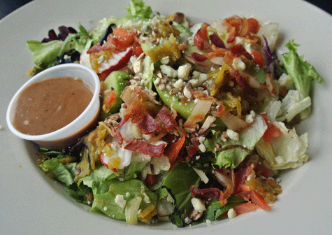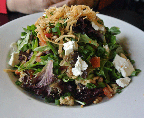 10 February 2013: Homer Simpson once chided vegetarian daughter Lisa that “you don’t win friends with salad.” With B2B’s Lemon Ginger Chicken, you might win their undying devotion. The name only begins to scratch the surface of everything going on with this ingredient-laden masterpiece of creative and concordant goodness. The foundation for the salad is a heaping helping of mixed greens and butter lettuce. Interspersed within that tangle of green and purple, you’ll find goat cheese, pecans and cranberries. The salad is topped with frytons (fried wontons). It’s a salad so good you might forgo a burger altogether.