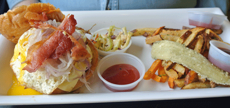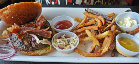 3 March 2013: The Sunrise is the perfect lunch or brunch burger answer to the ubiquitous breakfast sandwich. As with its breakfast counterpart, bacon (a New Mexico pecan wood variety) and a fried egg are key components of this burger. So is Pepper Jack cheese. At over easy, the egg yolk will run down the brioche bun and probably onto your hands. That’s where finger-licking (or napkins) comes in. The bacon is every bit as good as the popular applewood smoked bacon while the Pepper Jack cheese adds just a bit of punch.