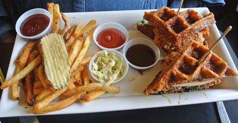 8 December 2013: Put the Waffle Burger (or maybe it’s a chicken sandwich) near the top of that list. Available only on Sundays, it’s unlike any burger you’ve ever had: a succulent Southern-fried boneless chicken nestled between two bacon, Cheddar, green onion buckwheat waffles served with sautéed kale and maple mustard with or without syrup. It’s chicken and waffles as you’ve never had them. Being skyscraper tall, the sandwich may be too large to put in your mouth as is, so you’ll likely eat its components separately. The buckwheat waffles have a surprising bite, courtesy of the maple mustard. The Southern-fried boneless chicken is moist, tender and delicious. Make it your Sunday surprise.