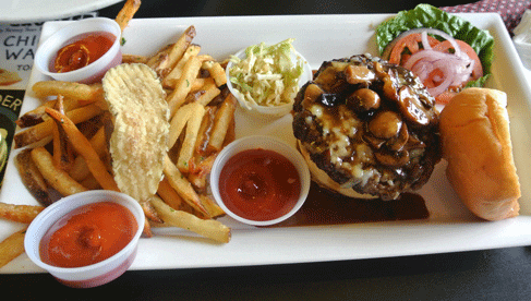 Included by request on all burgers are ketchup, mustard, mayo, butter lettuce, sliced red onion and vine-ripened tomato. Dietary and lifestyle considerations are addressed with a black bean veggie burger (sliced goat cheese, Szechuan sun-dried tomato sauce) for vegetarians and a topless burger in which any burger on the menu is served not on a bun, but on top of butter lettuce, spring mix, tomato, cucumbers and radishes.
