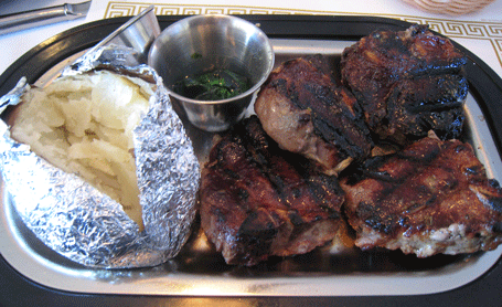 Opt for a baked potato instead of rice pilaf, French fries or oven-roasted Greek potatoes and you’ll be rewarded with a football-sized potato baked to absolute perfection. It’s served with butter, sour cream and chives, but an equally good topping is the aforementioned olive oil and feta mixture. The accompanying salads are anachronisms, the type of salads which might have been served in the 60s when the Town House first opened. That means iceberg lettuce, cucumbers, tomatoes, croutons and lots of dressing. The feta and bleu cheese dressings are quite good, albeit thin and light.