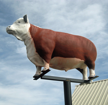 Among the most famous statuary art are life-sized fiberglass statues of stocky steers (corpulent cows and beefy bulls, if you prefer) which became the symbol of steakhouses along the motorways and byways. Ironically, this statuary was not designed for use as symbology for restaurants. In the 1950s, Bob Prewitt, a manufacturer of fiberglass trailers created life-sized fiberglass animals to prove the trailers were large enough to accommodate the real thing. Soon the manufacture of animals became the primary focus of his business. He created almost as many types of animals as Noah took on board his ark. The steer became one of the most popular. Restaurants such as the Hilltop Steak House in Saugus, Massachusetts actually have corrals full of Hereford and black Angus statues on display.