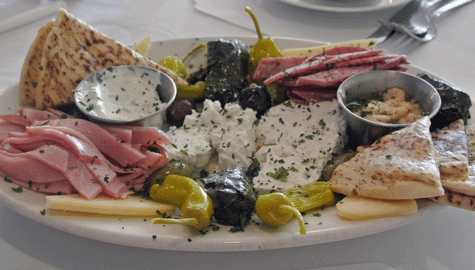 The antipasto plate has a bit of everything and then some: stuffed grape leaves, Kalamata olives, Pepperonici, feta cheese, Kasseri cheese (a sharp, salty and hard cheese with a Cheddar-like texture made from sheep or goat’s milk), ham, salami, garlic dip, pita bread, and taramosalata as well as a number of pickled vegetables (carrots, artichokes, cauliflower and more). If you’ve never had taramasalata, you’re in for a treat. It’s a Greek style “poor man’s” caviar traditionally served as an appetizer. Consisting of carp roe, breadcrumbs soaked in milk, olive oil and more, it is whipped until light and fluffy. It’s wonderful on its own or spread onto the restaurant’s signature pita bread.