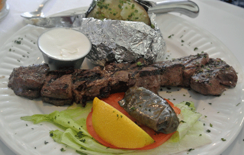 A house specialty is an “all meat” shish ka-bob, chunks of lean meat (your choice of top sirloin, chicken or pork tenderloin) marinated in the Townhouse’s special marinade. Unfortunately you have to select only one of the three meats and can’t have a mix of all three. Nor does the shish ka-bob include grilled onions and bell peppers, two seemingly de rigueur shish ka-bob standards. This is a meatfest, a carnivore’s delight. The marinade appears to be a fairly standard Greek recipe that includes lemon and olive oil. The broiler sears in a light char that gives the bite-sized ka-bobs a slight crust, but doesn’t detract from the moistness of the top sirloin.
