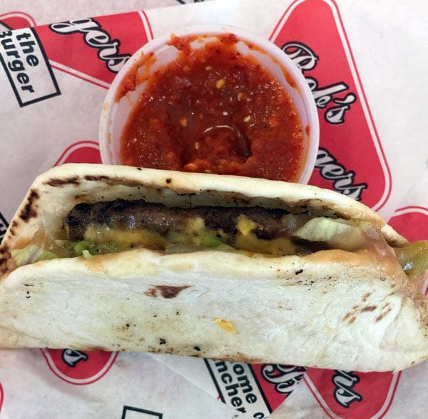 Locals can handle the degree of heat in Bob’s featured fare pretty easily, but out-of-towners might consider it cruel and unusual punishment to consume the Ranchero burger or any of the other chili laden items on the menu. Unlike the green chile used on many green chile cheeseburgers throughout the Land of Enchantment, Bob’s chili warrants a sweaty brow, scalded tongue salute. There are two Ranchero Burgers on the menu, a Supreme (green chile, lettuce, tomato, cheese) and the standard Ranchero (green chile only) and they’re available in small or large sizes.