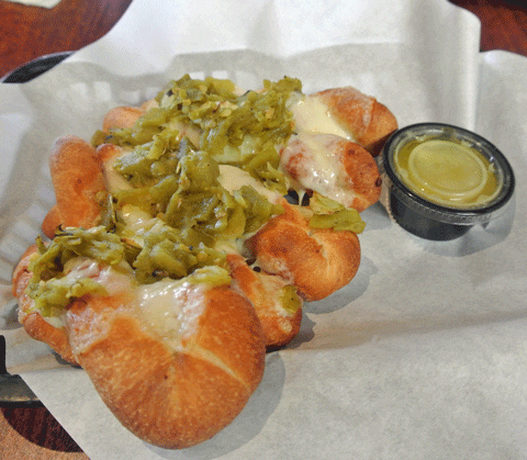 Breadsticks with cheese and green chile (garlic butter dipping sauce)