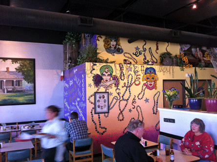 The Cajun Kitchen is festooned in the traditional Mardi Gras colors of purple (representing justice), green (representing faith) and gold (representing power). One wall is bespangled with expressions of “Fat Tuesday” celebrations: multi-colored beads and bangles, Mardi Gras masks and more. Some of the green comes in the form of a large mural depicting a bayou swamp replete with a large alligator and other fauna and flora indigenous to the bog. The gator’s mouth is open wide, a mere foot or so away from the open kitchen.