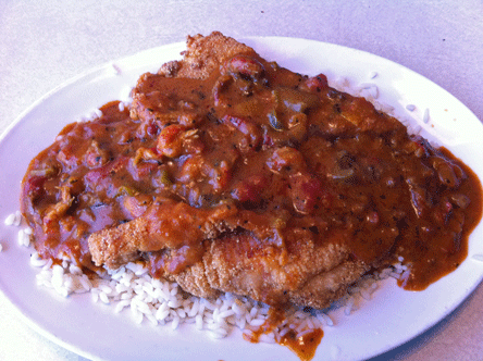 It’s because we love the fried catfish so much that the entree I’ve had most often is catfish smothered in crawfish etouffee, an absolutely stunning dish brimming in the rich, flavorful spices that make Cajun cooking so popular. The basis for the Cajun Kitchen’s etouffee, a French word for “smother” is a thick, well-seasoned tomato sauce served over perfectly prepared white rice. The sauce wholly dissimilar to the tomato sauces used in Italian cooking. It’s redolent with the fragrance of the holy trinity and the olfactory-arousing seasonings so prevalent in Cajun cooking.