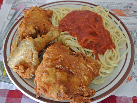 Out of curiosity after seeing it destined for quite a few other tables, my Kim ordered the fried chicken during our second visit. An order of fried chicken means a half bird–thigh, leg and wing. The chicken is breaded rather thickly and doesn’t have as much white and dark meat as we would have wanted, but the meat we were able to extricate from the bony carcass was juicy and delicious. The fried chicken is normally accompanied by French fries, but you can ask for spaghetti instead.