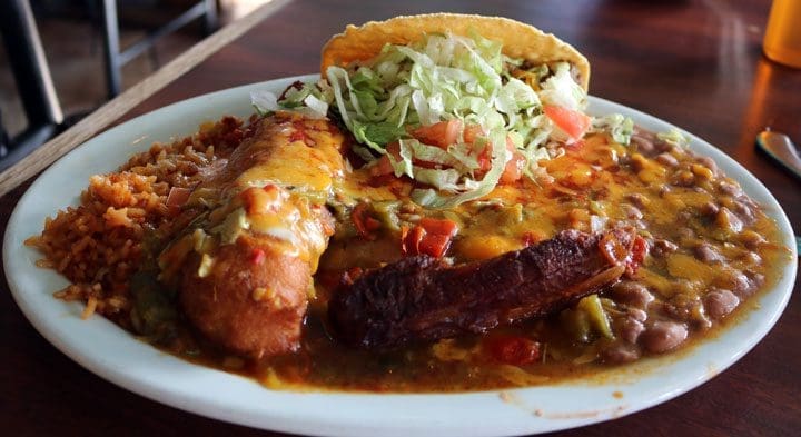 3 January 2017: Perhaps the best way to experience the restaurant’s culinary wizardry is by ordering one of the four combination plates. Combos are served with beans, rice, one very special rib and sopaipillas. Combination plate number one features a cheesy enchilada, a taco, a crunchy chile relleno and a tamale. Of these, the real stand-out is the crunchy chile relleno whose sweet, battered texture is unlike any other we’ve had in Albuquerque. The special pork rib is unique to Casa Benavidez. It’s a real treat. Be forewarned that combination plates are humongous–large enough for two.
