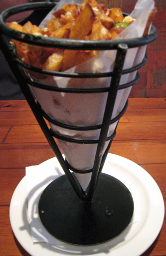 In recent years, particularly in French brasseries and bistros, French fries doused with truffle oil have become almost de rigueur Because actual truffle oil is so expensive, almost all restaurant truffle oils are a synthesis of olive oil and an organic odorant found in truffles. The truffle oil used at the Chama River Brewery on their truffled Bleu cheese fries is very reminiscent of real truffles and it works wonders on the French fries, hand-cut gems fried to a crispy golden hue. The fries are bespattered with truffle oil, blue cheese crumbles, applewood smoked bacon bits and chopped scallions, an improvement over fries with ketchup by several orders of magnitude.