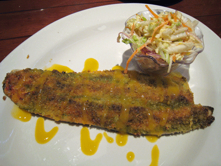 One example is the Jerk Crusted Red Trout which is normally served with lobster-basil mashed potatoes and green bean saute. Order it even for a late lunch and you can forget about the potatoes and green beans. You might not miss them too much because the jerk crusted red trout is excellent. The jerk seasoning mix imparts several flavor combinations that go very well with the trout–flavor combinations that don’t overwhelm the delicate trout with incendiary heat so often prevalent in jerk seasonings. The trout is also lightly drizzled with a “Mandarin glaze” the color of baby food. Unlike some Americanized Chinese glazes which can be absolutely cloying, this one is light on the sweet and sour properties, again complementing the fish quite well.