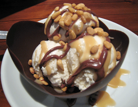 Desserts at Chama River are a not-to-be-missed event–almost as inventive as they are delicious. The Piñon Cup showcases a combination of flavors, textures and even nationalities. It starts with a Belgian chocolate cup, whisper-thin at the sides but formidable at its base to hold in a couple of scoops of premium vanilla bean ice cream. The ice cream is then topped with dulce de leche (a thick caramelized sauce used throughout Latin America) and Mexican chocolate sauce then topped with piñones. The roasted piñon flavor so reminiscent of pine is the topper in many ways, but the entire dish is really a tribute to creativity. The marriage of Belgian and Mexican chocolates is a marriage of contrasts, but contrasts which complement one another so very well. This is a memorable dessert…but it’s not even the best dessert on the menu.