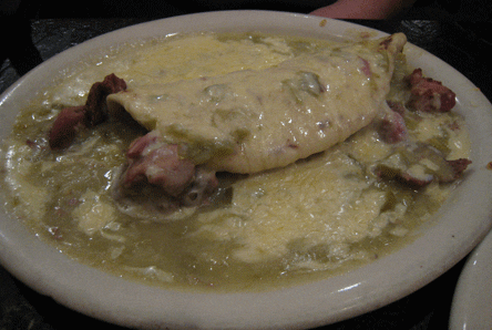 At least once in your culinary explorations around the Duke City, you’ve got to try Charlie’s carnitas, cubed and shredded fried pork seasoned to perfection and served with fried potatoes like grandma used to make (boiling potatoes before frying them). These carnitas are among the very best in the Duke City and can be ordered with or without chile. One entree in which those carnitas are featured is Kay’s Special in which a homemade tortilla is engorged with carnitas and topped with a melting white cheese and green chile. Alas, you might have to be a turophile (a connoisseur of cheese) to truly enjoy this entree. The cheese is an excess of richness, so much gooey goodness it should be served with an angioplasty.