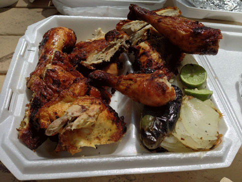 I love the chicken at this food truck! 1/2 chicken feeds me for 2 meals. You forgot to mention the whole roasted jalapeno that comes with the meal. That is an added treat for me. I don’t find the sauces incendiary at all, medium hot at best with the green being mildest. I usually have to add my own heat. The beans are delicious and you can make a great taco with the tortilla, chix and beans. The chicken is great with some lime juice squeezed on it from the limes that accompany the meal. I especially like having this with an ice cold cerveza at home!