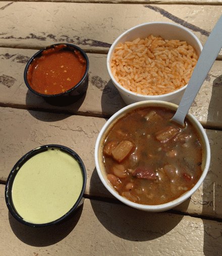 A whole chicken order includes two incendiary salsas–a light green guacamole-based salsa and an even more fiery red salsa. They’re both rather strong and will dominate the flavor of the pollo so apply them judiciously. Better yet, create a sandwich from the accompanying sweet grilled onions and corn tortillas. The whole chicken also includes some of the very best beans in New Mexico. Seriously! The beans are infused with a smoky flavor and chunks of pork. The rice is moist and buttery.