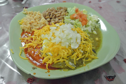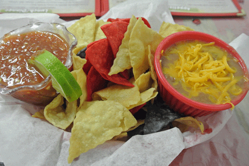 Salsa isn’t complimentary, but it’s the starter with which every New Mexican food meal should begin. The salsa has a pleasant piquancy with a respectable bite. It’s served with red, yellow and blue corn chips which are served warm to hot. The salsa is thick enough to be a “scooping” salsa and not a “dipping” salsa. It’s better than so many bottled salsas you’ll find–even better if you pair it with an order of the beans-cheese dip, soupy pintos with shredded Cheddar cheese. Why more New Mexican restaurants don’t serve a beans-cheese dip starter is beyond me.