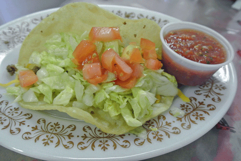 Make sure to have a taco on the side. The tacos–ground beef, lettuce, chopped tomatoes and salsa–are quite good, served in a deep-fried corn tortilla fashioned as a shell for the other ingredients. The corn tortilla is both pliable and crispy, providing an enjoyable textural contrast. The ground beef is nicely seasoned and doesn’t have the “refried” flavor of far too many tacos served in New Mexican restaurants.