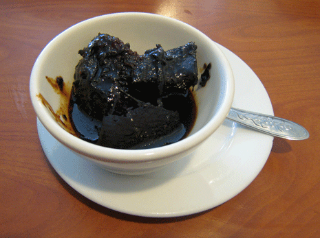 20 May 2012: In recent years, perhaps as an offshoot of bacon’s popularity, one of America’s favorite gourmet cravings has been for pork belly. The Chinese version is called Dong Bo Pork and it’s fabulous. On the bowl in which it’s served, it bears an almost off-putting resemblance to fatty pork served in ink or tar. The sauce in which it is served is a Hoisin-soy sauce mix that’s wholly unnecessary, but quite good. This half-lean meat and half-fat pork belly dish is a wonderful study in textural contrasts, but if you like pork regardless of texture, it’s a dish you’ll love.