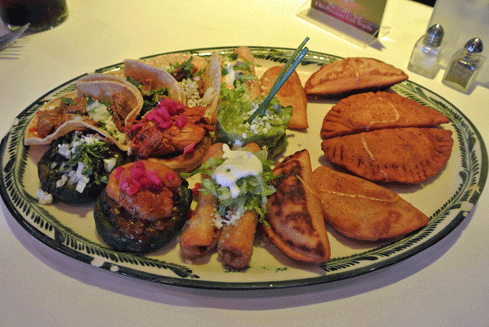 The Entremes Surtido, a turkey platter sized offering, features a family-sized assortment. At the center of the platter is a large dollop of lime-infused guacamole, among the most fresh and delicious we’ve had. The shrimp and crab empanadas are also a winner with notes of briny freshness. Perhaps our favorite were the three sopecitos, three fried breads each topped with different ingredients in a chipotle sauce. The cochinita and especially the cuitlacoche (corn smut) stand out. Four quesadillas–two with mushrooms and two with poblano chile strips–were more “airy” than ingredient and flavor packed while four rolled taquitos accentuated the flavor melding of potatoes and homemade chorizo. The danger with ordering a platter such as this one is you might not have much room left for your main entree and you’ll certainly want to enjoy every morsel of your main course.
