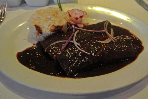 That’s especially true if you order the enchiladas de pato two shredded duck enchiladas bathed in a sun-dried prune mole sauce. It’s the dish Jim recommended. Two large corn tortillas, redolent with the flavor of fresh corn, are engorged with shredded duck meat then topped with a spectacular mole. To far too many diners in America, “mole” is just the four letters which complete the avocado dish of guacamole. To discerning diners, mole is a sophisticated and complex sauce, the preparation of which is often laborious and unique. The sun-dried prune mole sauce is made from dried chile peppers, ground nuts and spices, Mexican chocolate, shredded tortillas and a variety of other ingredients. This mole is very rich, flavorful and complex with subtle notes of its constituents sneaking through. The duck (pato) meat is mostly lean with just a bit of fat for flavor. Only sharing this meal with Jim and his beloved child bride would have made it better.
