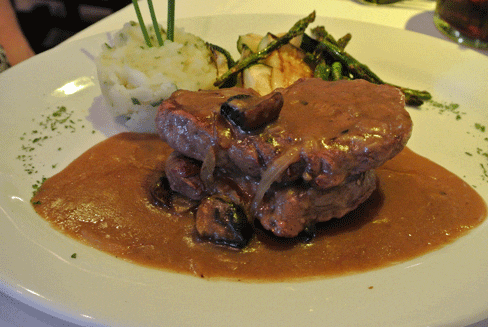 For my Kim whose preferences in exotic foods lean toward the safe and uninteresting, it took just a bit of Kissingeresque diplomacy to convince her the entree to order was the Filete Al Tequila, a filet mignon in a tequila and red wine reduction topped with cambray onions and mushrooms. This dish is a stupendous success! If you’re used to filet mignon being prefaced by “petite” on the menu, you’ll be pleased to see two stacked slabs of sumptuous, tender and lean beef, one atop the other. The filet is nearly fork tender with nary a hint of fat. With or without the tequila-red wine reduction sauce, the filet is extremely flavorful, as good a steak as we’ve had in recent travels. The filet is served with mashed potatoes (wonderful for sopping up the sauce) and a vegetable medley, but not the dreaded succotash medley school children despise. This medley featured zucchini and asparagus, both smoked and delicious.