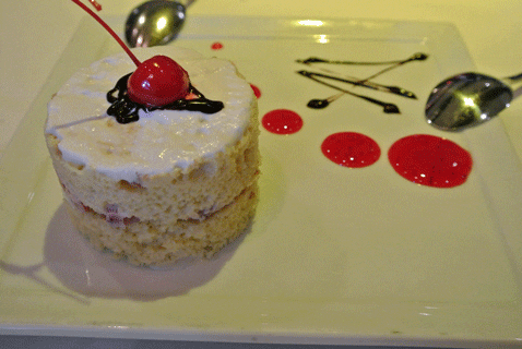 Dessert isn’t quite an after-thought at El Agave, but with only four selections, it’s not the most interesting post-prandial menu either. The pastel tres leches is a very good choice. Rich, decadent and moist courtesy of the three milks-sweetened condensed milk, evaporated milk and heavy cream–that make up this cake, it is light in flavor, but not in calorie and fat content. This tres leches cake is cut and served round with decorative raspberry and chocolate drizzles on the plate.