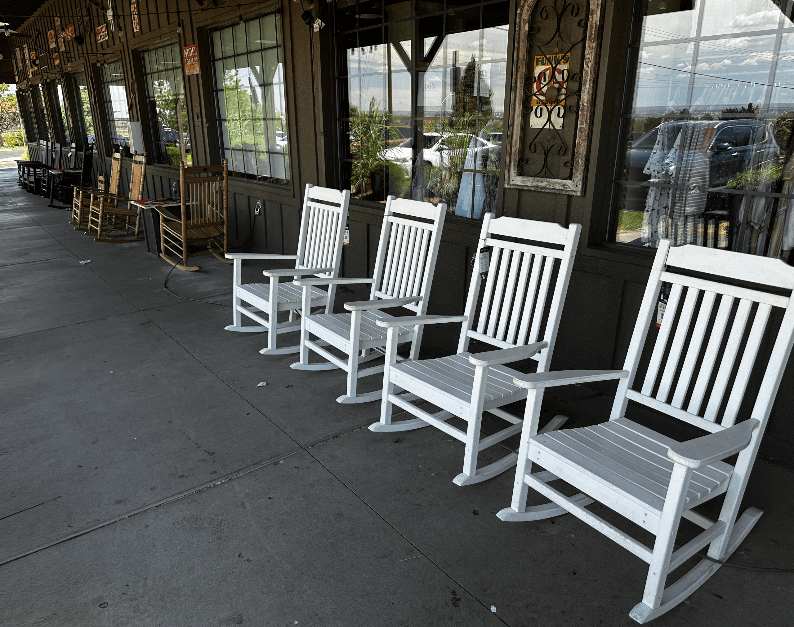 The Cracker Barrel’s template does bespeak (rather loudly) of Southern stereotypes. The facade resembles that of an old country store with a corrugated tin roof and a porch extending the entire length of the restaurant’s frontage. As at some country stores (which tend to be the cultural and social hub of small communities) in the Deep South the porch is the center of hospitality with dozens of sturdy oaken rocking chairs of all sizes lined up for neighborly visits. Veterans will appreciate the rocking chairs in which the seals of the different branches of the armed forces are embedded onto the top slat. The porch, by the way, provides a perfect western-facing vantage point for one of our amazing New Mexico sunsets.