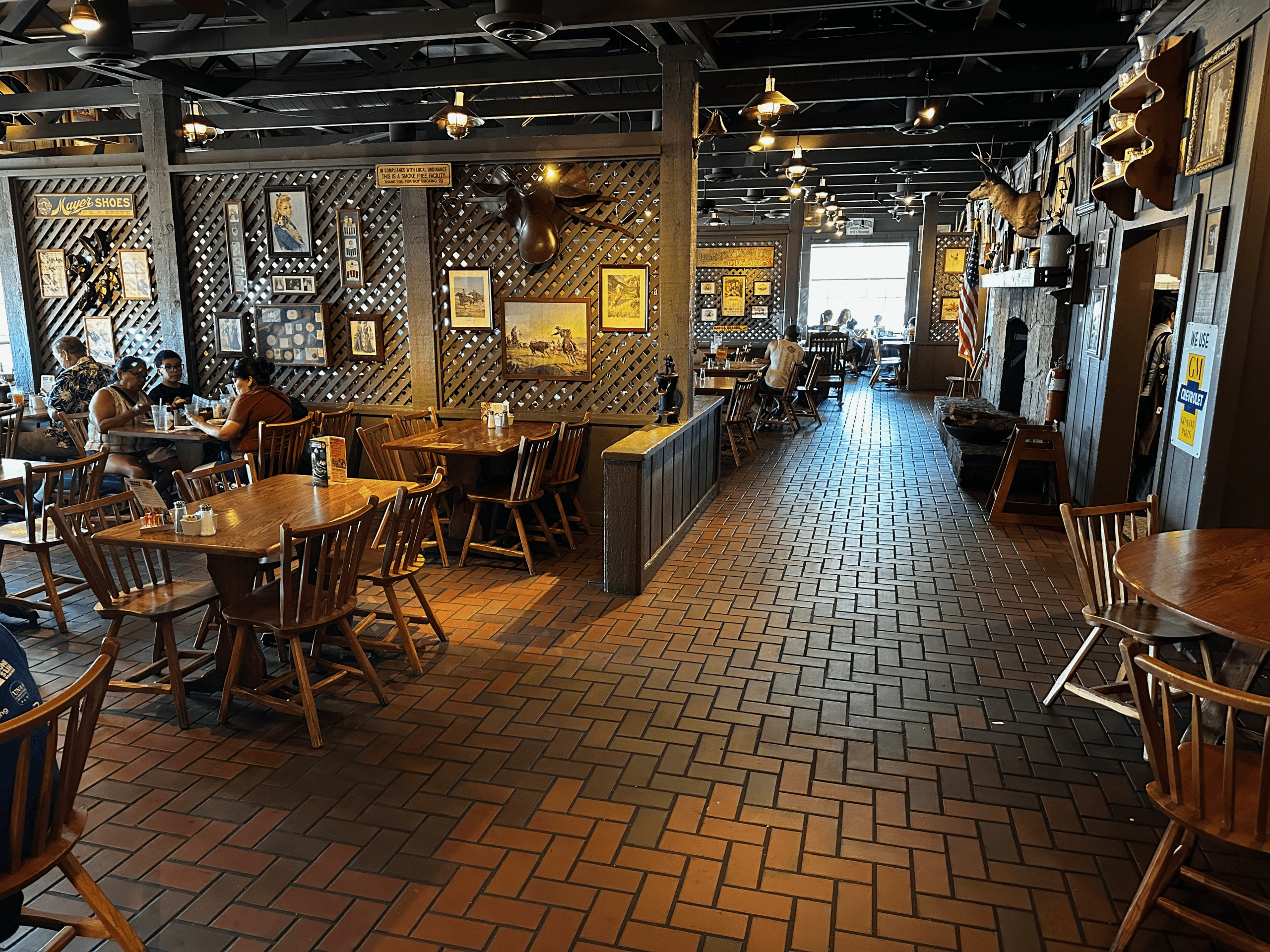 The country theme continues onto the Cracker Barrel’s dining rooms where walls abound in sundry brick-a-brac. Vintage sepia-toned photographs of mostly unsmiling countenances survey the room. A large brick fireplace with a heavy oaken mantle is the cynosure of one dining room. The handiwork of a taxidermist is on display on some walls with the deer smiling more broadly than the stoic faces on the vintage photographs. The dining rooms are expansive though some seating is of personal space proximity.