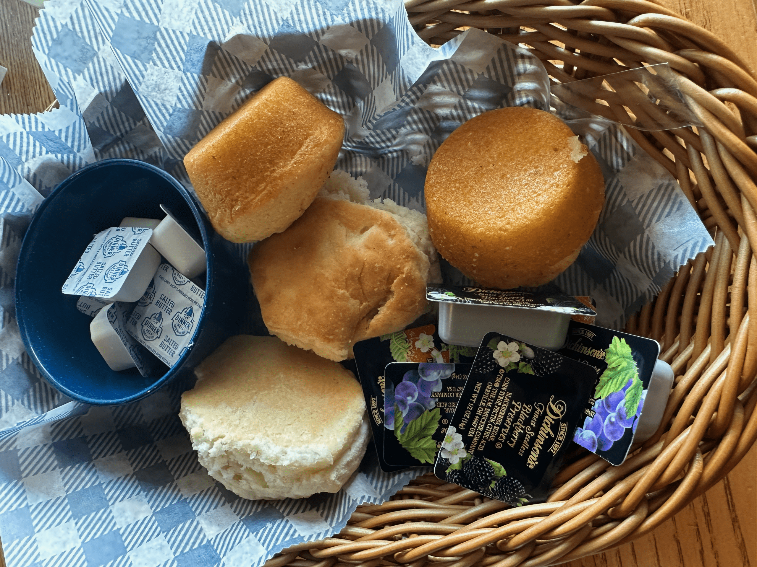 Most lunch and dinner entrees are served with your choice of one, two or three “premium” or “country” sides, the former being somewhat more expensive if ordered separately. In the Cracker Barrel’s vision of the south, sides means turnip greens, coleslaw, steak fries, mashed potatoes, breaded fried okra, hashbrown casserole, dumplins, whole kernel corn, country green beans, sweet whole baby carrots, fried apples, macaroni n’ cheese, apple sauce and pinto beans. There is absolutely NO green or red chile anywhere on the menu nor are the “country vegetables” strictly vegetarian. Meals are also accompanied by made from scratch buttermilk biscuits or corn muffins and real butter (in those real annoying little tubs).