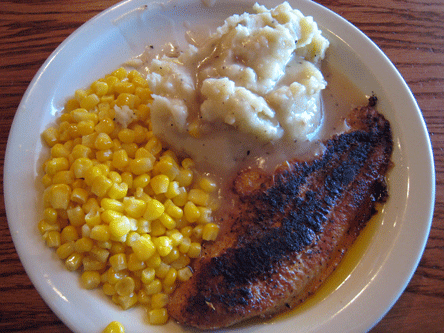 14 April 2011: Deciding on what to order at a chain restaurant is an arduous process for me and no matter what I ultimately end up with, my very low expectations about liking what I order invariably wind up ending in a self-fulfilling prophecy. With few exceptions, I order the “lesser of all evils,” generally something out of Home Economics 101, a dish any beginning cook can make edible (if lucky, made to taste good). For my first visit to the Cracker Barrel since a team-building activity nearly a decade ago, the lesser of all evils would be spicy grilled catfish.