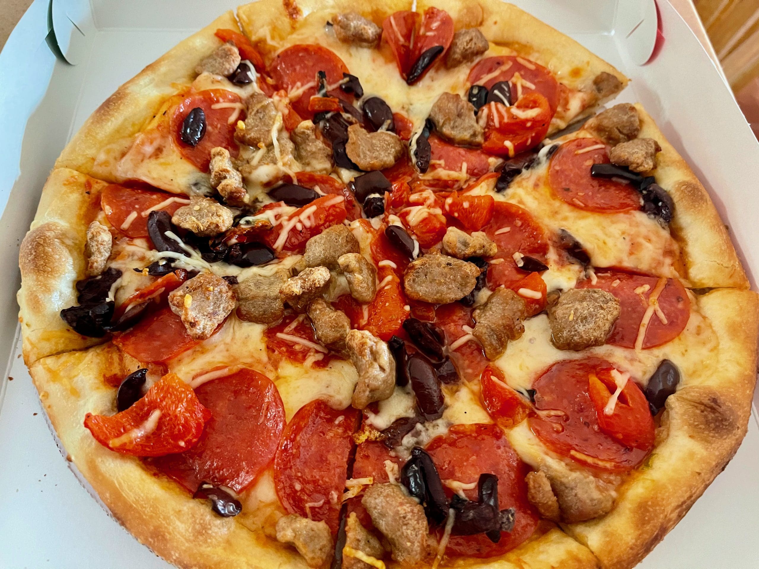 3 February 2021: Dion’s venture into the realm of gourmet pizzas is a popular draw, though my experiences with these so-called gourmet pizzas have also met with mixed results. A Kansas City pizza features a barbecue sauce so insipid renders the pie’s name a misnomer. As a devotee of Kansas City barbecue, my expectations for s sauce bearing that bastion of barbecue’s name are high indeed, and Dion’s pizza failed to meet those expectations. Much better is the Napoli (marinara, Provolone, Italian sausage, Kalamata olives, pepperoni, roasted red peppers and Parmesan) which would have been outstanding were it not for the saltiness of the Kalamata olives. Knowing how salty Kalamata olives are and considering my dislike for salty foods, I shouldn’t have ordered the Napoli. That’s on me.